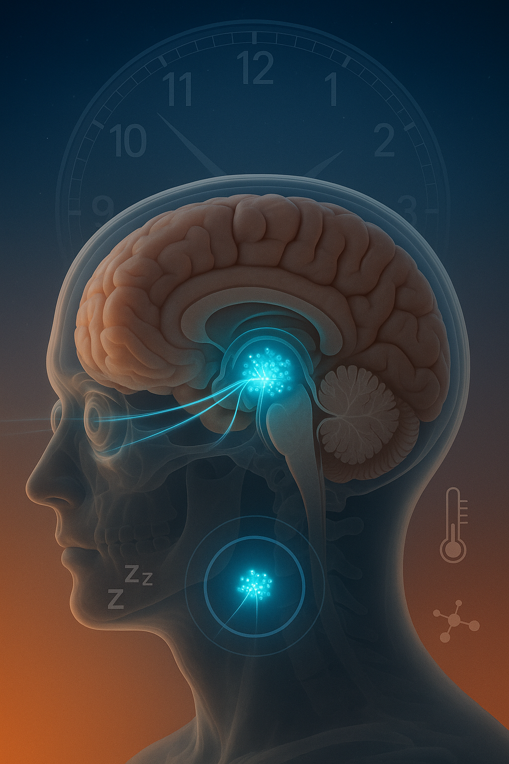 Los ritmos circadianos son ciclos naturales de aproximadamente 24 horas (1) que regulan diversas funciones de nuestro cuerpo, incluyendo el sueño, la liberación de hormonas, la temperatura corporal, la respuesta inmune entre otros (2). Estos ritmos están influenciados principalmente por señales ambientales y genéticas (3) , particularmente los ciclos de luz y oscuridad, siendo controlados por un "reloj biológico interno" ubicado en el núcleo supraquiasmático del hipotálamo (4).
